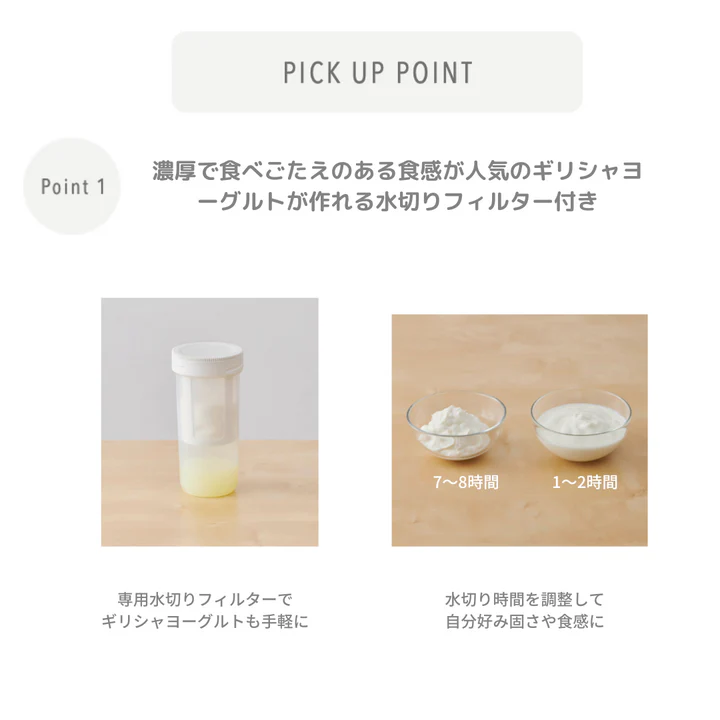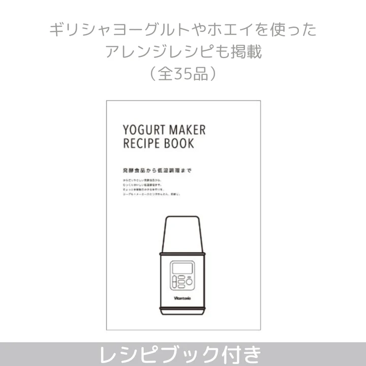 | 付属品 | 容器×1個、スプーン×1個、牛乳パックカバー×1個、水切りフィルター×1個、カラーレシピブック×1 |
