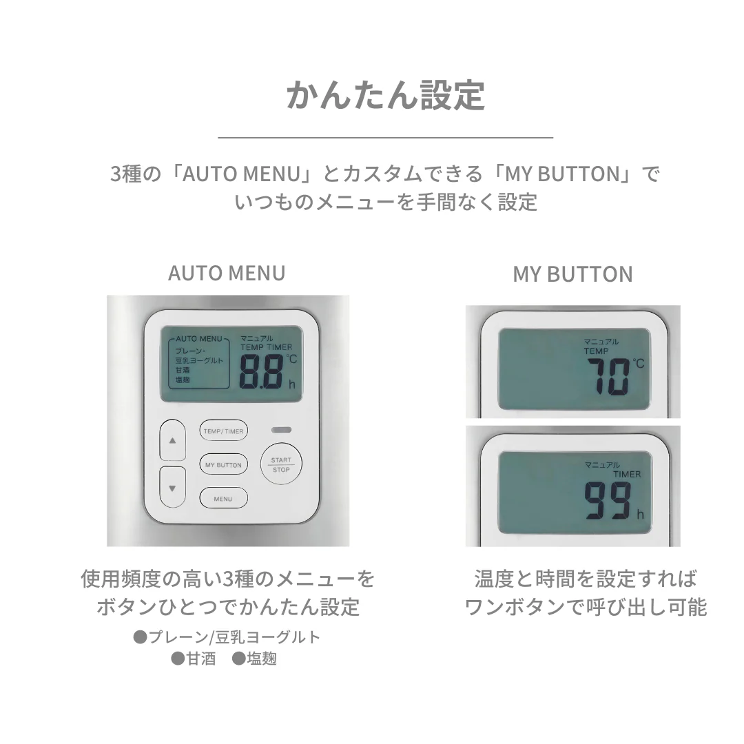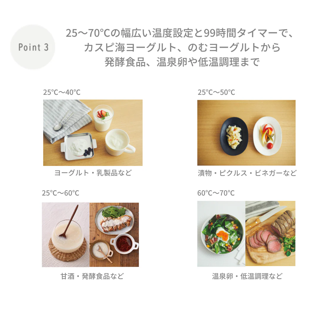 牛乳パックも専用容器もそのまま使えて、手軽にヨーグルト作りが楽しめるヨーグルトメーカー。25℃〜70℃まで1℃刻みの温度設定と99時間タイマー付きで、甘酒・塩麹・低温調理など、発酵食品や調理の幅もぐっと広がります。水切りフィルター付属で、濃厚なギリシャヨーグルトの自家製も可能。